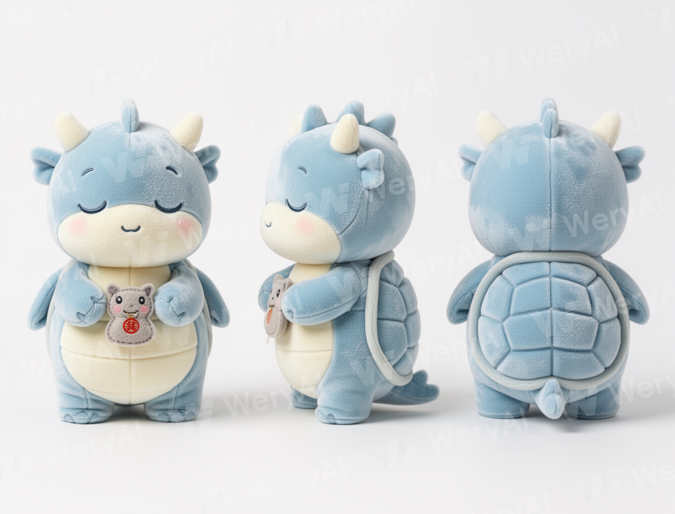 Three-view drawing of a super soft baby soothing doll, character sheet, front view, side view, back view, cute chibi dragon-turtle hybrid, marshmallow-like round shape, premium short-pile velvet fur texture, baby blue and creamy white color palette, tiny soft nubby horns, sleepy gentle expression, simple embroidered eyes and mouth, holding a small felt lucky charm, full body, neutral studio lighting, white background, high quality, 8k