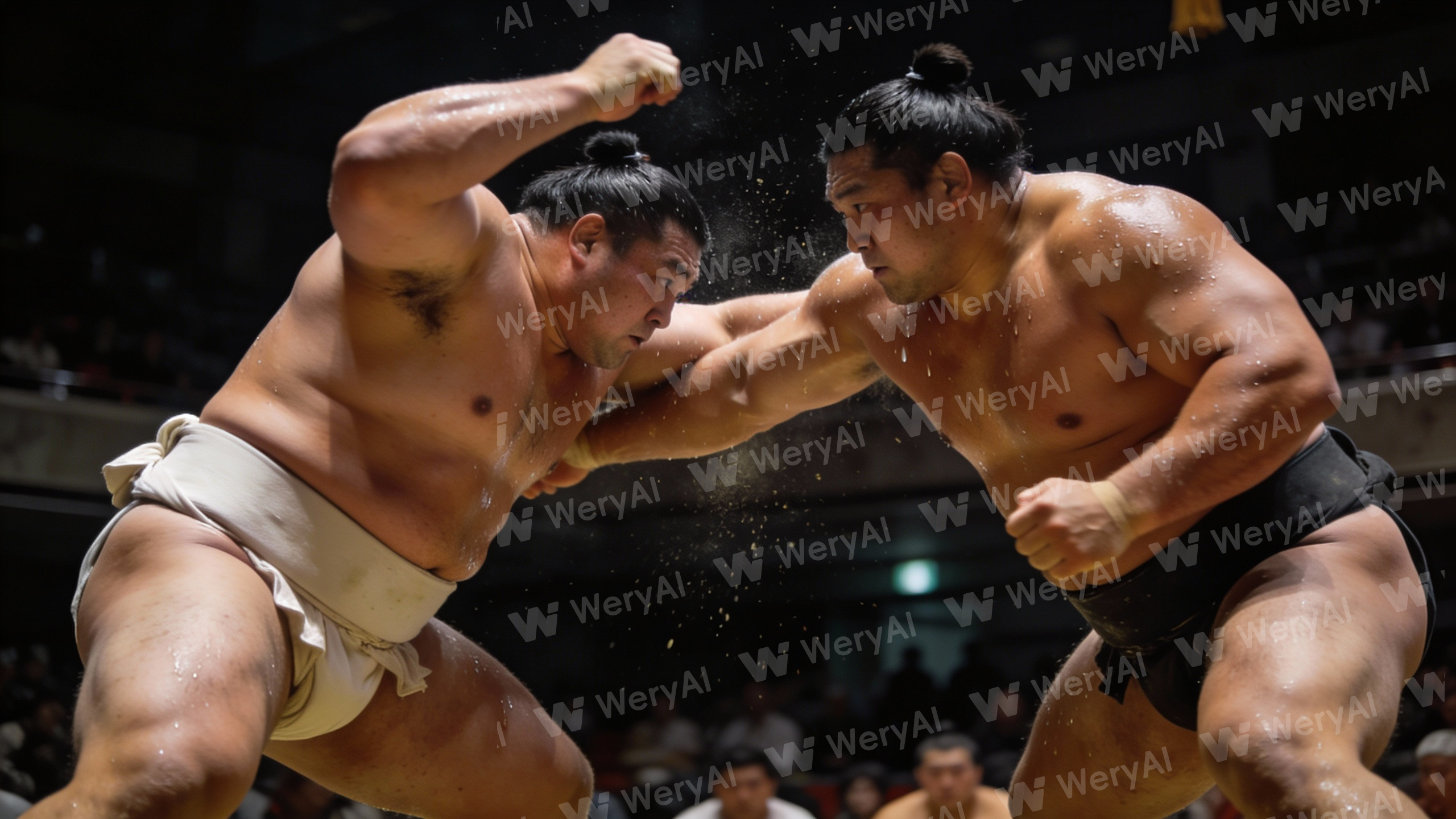 Inside a gymnasium, two sumo wrestlers are wrestling intense...