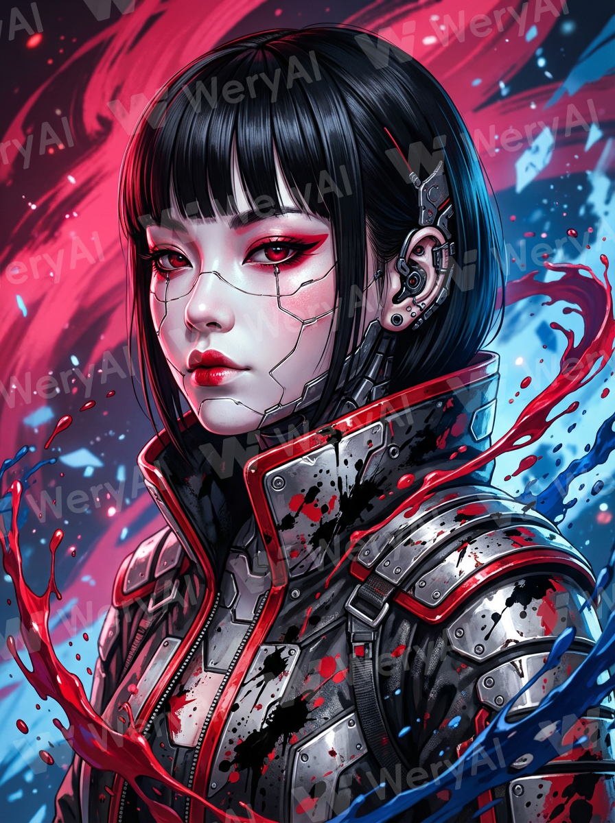 Decorations: Red and blue dynamic ink splash art surrounding the figure, precision mechanical prosthetic structures on the sides of the ears, micron-level precision at the skin-to-metal interfaces.